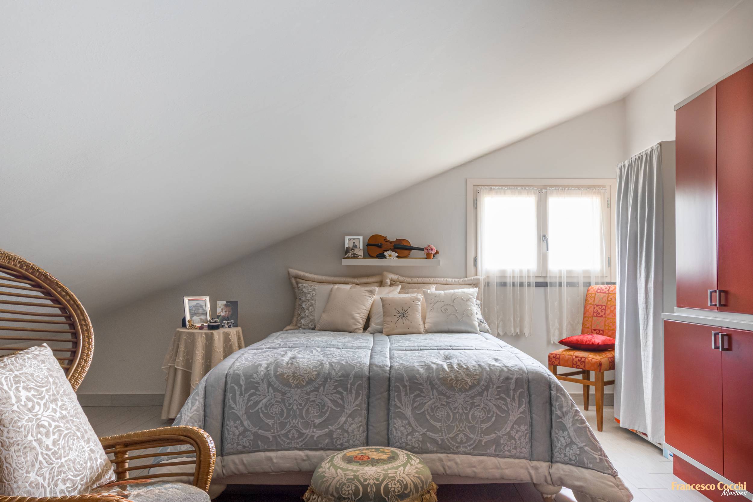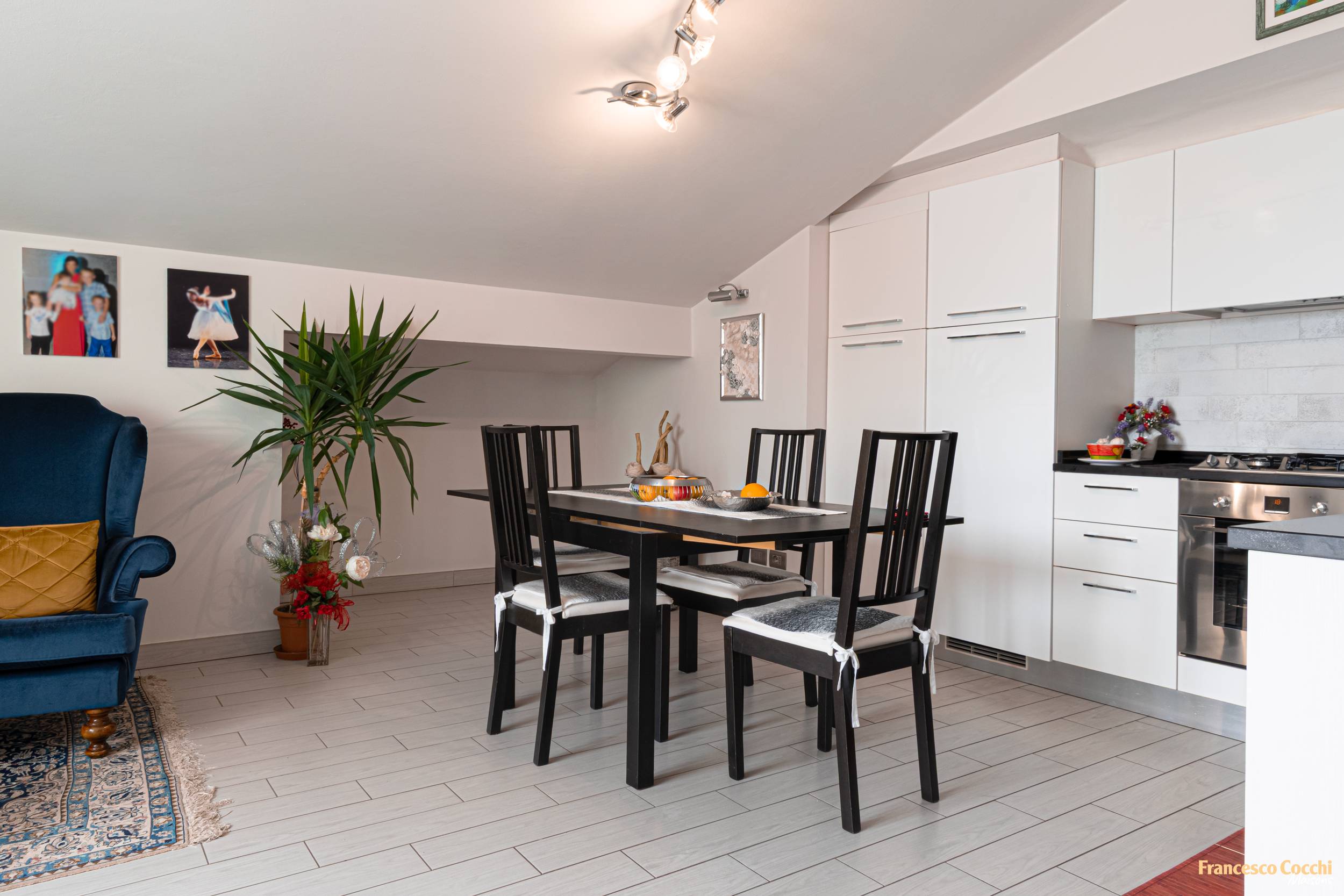 Il piano sottotetto di circa 100 metri quadrati, anch’esso abitabile e indipendente, ospita un soggiorno open space con cucina, angolo pranzo e zona relax, terrazzo a tasca, due camere matrimoniali e un bagno finestrato con doccia.